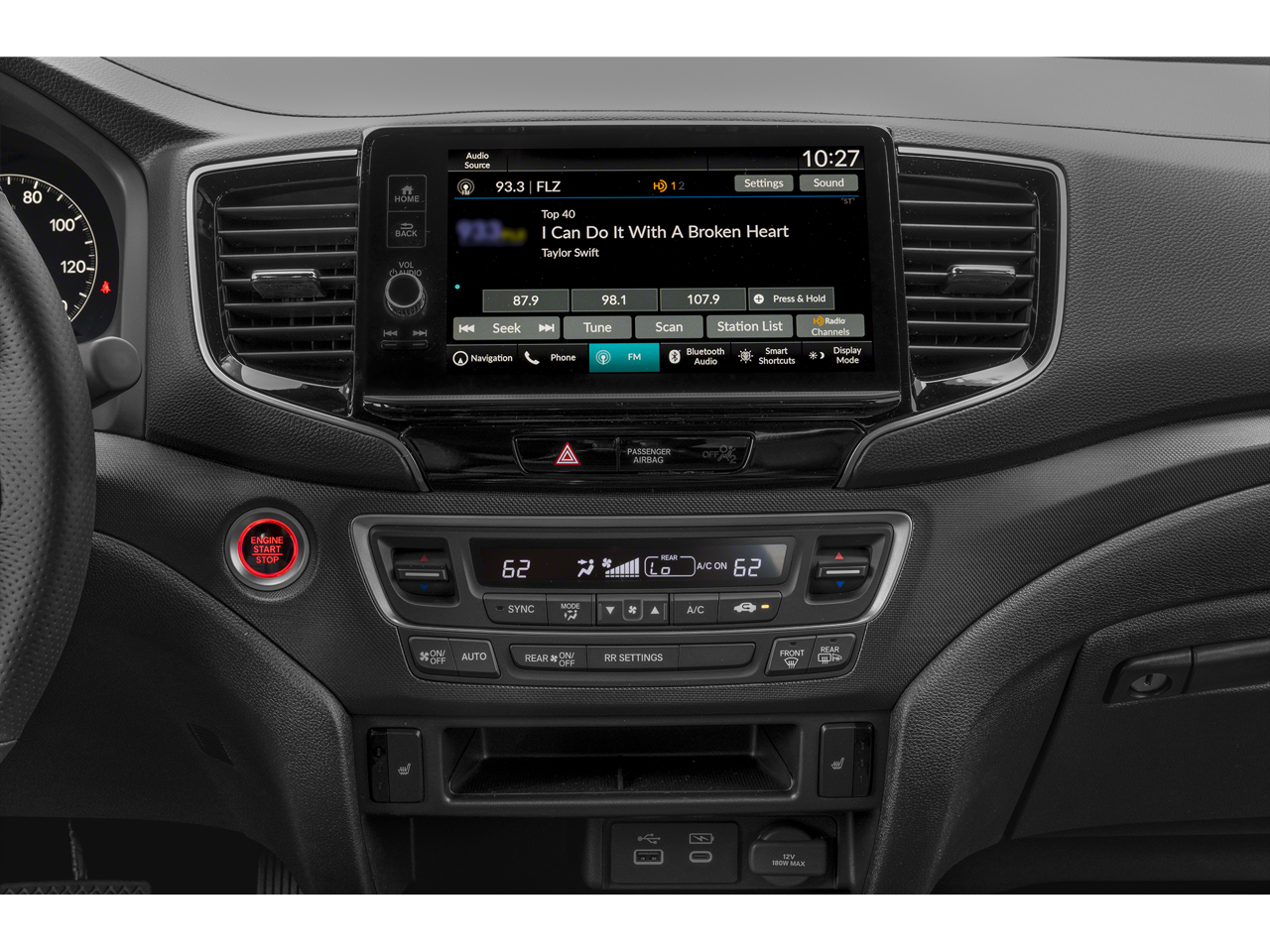 - Radio: 215-Watt Audio System w/7 Speakers -inc: subwoofer, 9" color touchscreen, Bluetooth® streaming audio, Speed-Sensitive Volume Compensation (SVC), wireless Apple CarPlay/Android Auto compatibility, HD Radio and 2.5A USB-A data port in front console, HondaLink, Select HondaLink features are complimentary, 36-month complimentary trials are available for security and remote packages, A subscription is required to continue HondaLink services after the trial ends