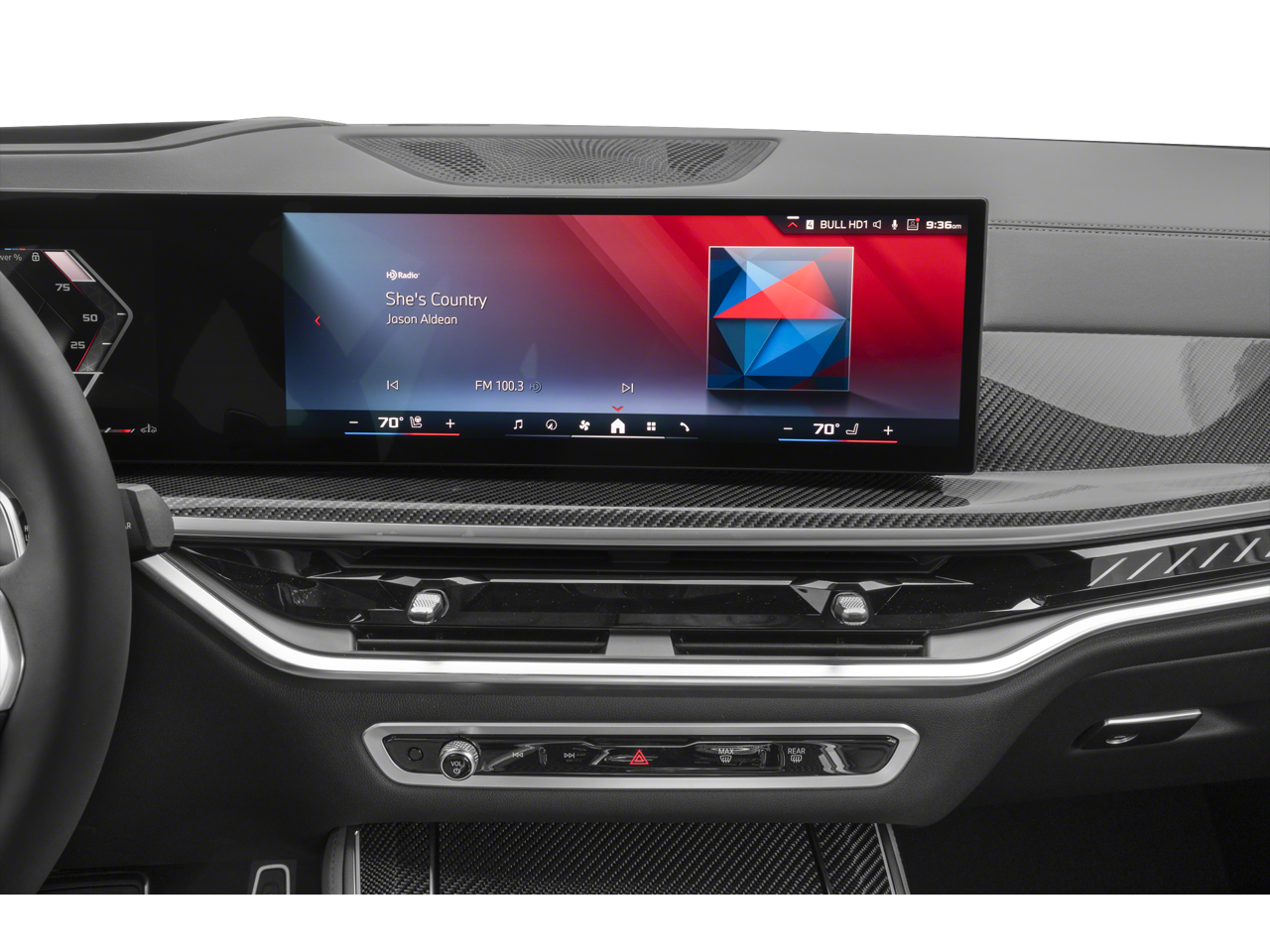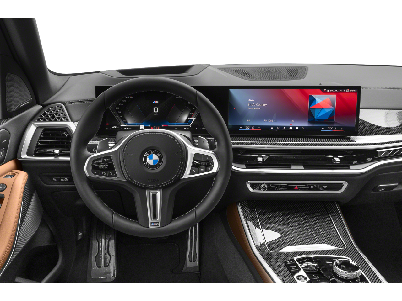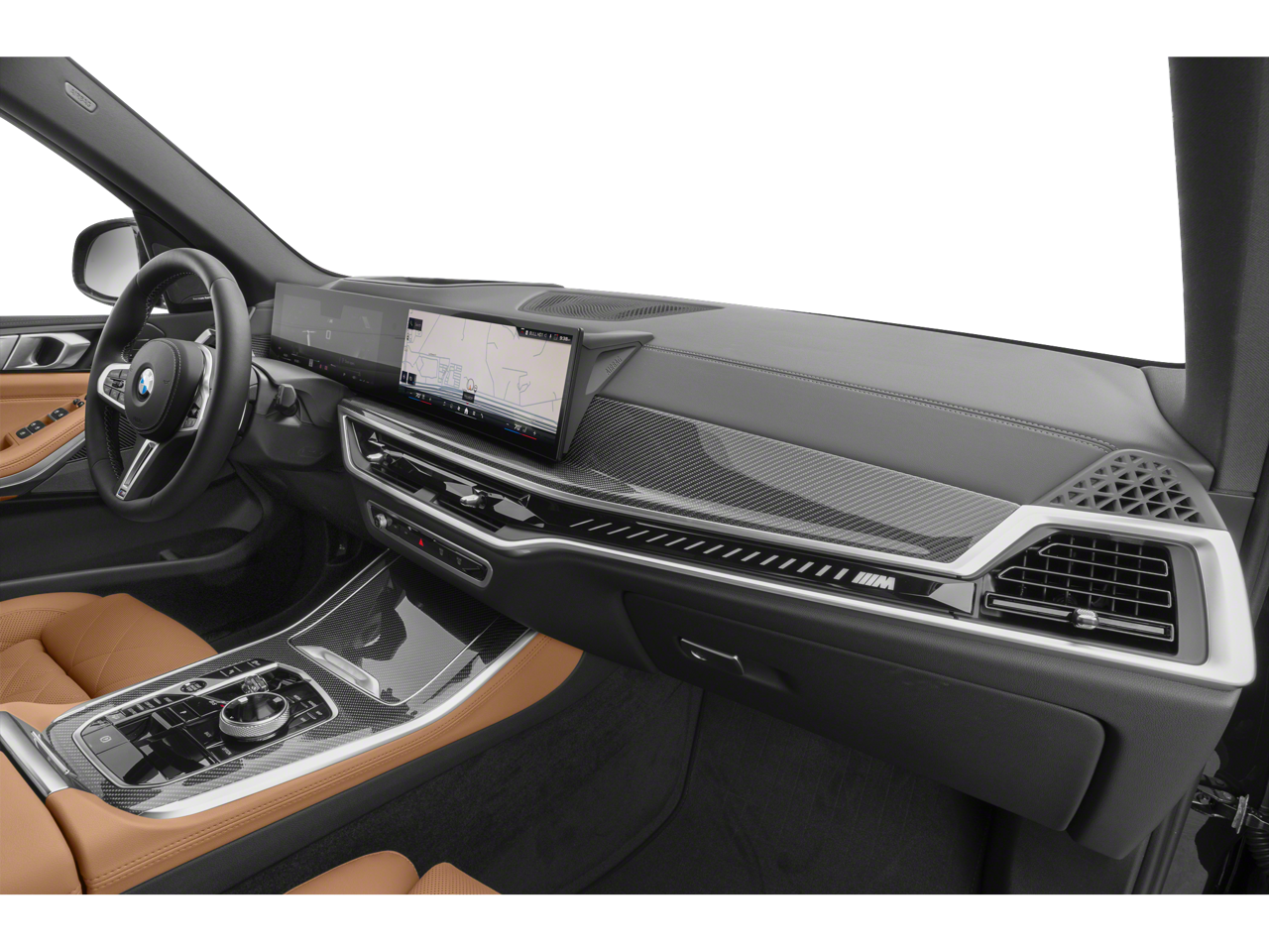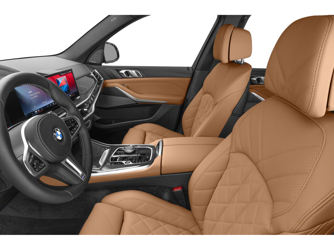 Inside our X5 M60i enjoy heated/ventilated front Sensafin seats, power front seats, wood trim, a curved 12.3-inch driver display and matching large touchscreen, wireless Apple CarPlay®/Android Auto®, Bluetooth®, wireless charging, Harman Kardon audio, and keyless access with pushbutton start.